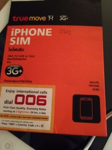 TRUE MOVEでは、iPhone用と銘打った高速通信プリペイドSIMが用意されているので、非常に楽です。非常によく出来ていて、SIMは、iPhone4/4S、iPadで使用するマイクロSIMにも、iPhone3G/3GSで使用するミニSIMにも切り取れるようになっています。99バーツ(250円くらい)で70MBのデータ通信、WiFi1時間分と15分の無料通話がついています。