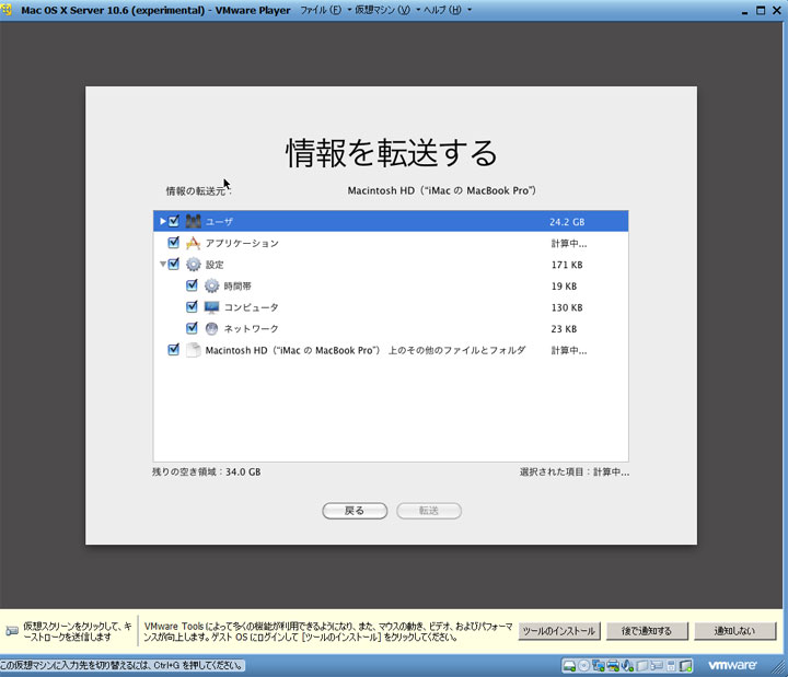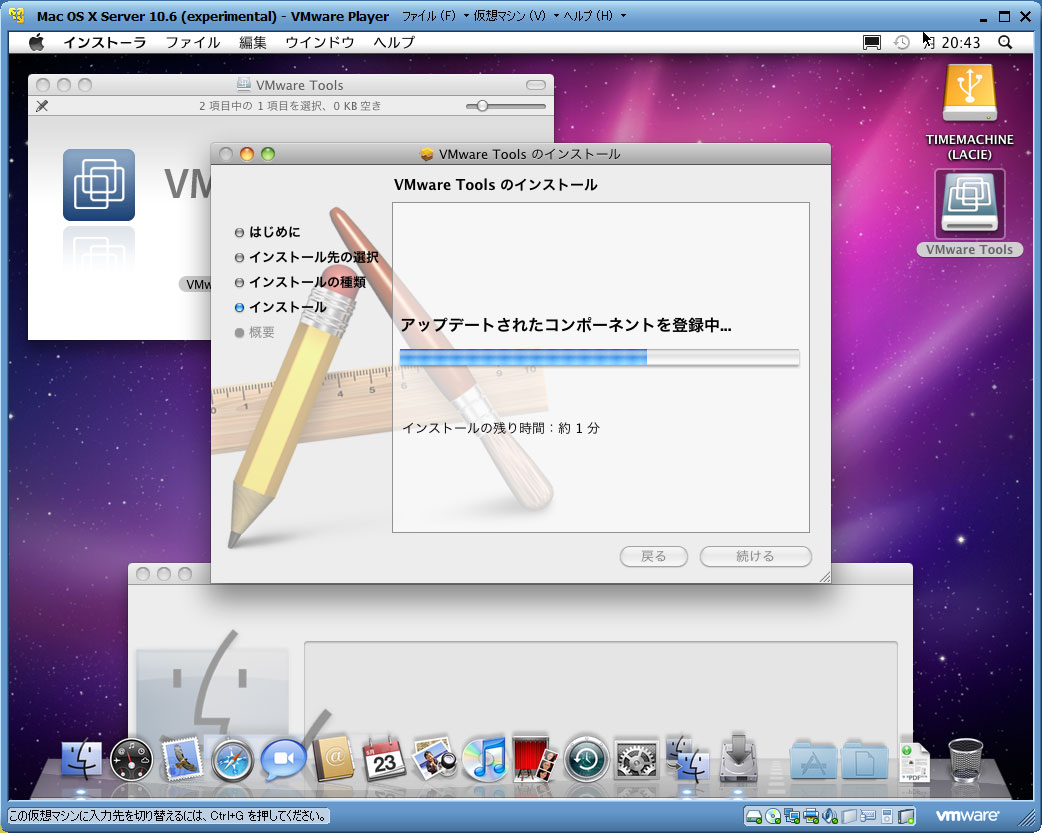 (10.6のDVDはDVDドライブに挿入済み、VMware playerがインストール済みで、snowyは解凍済み)