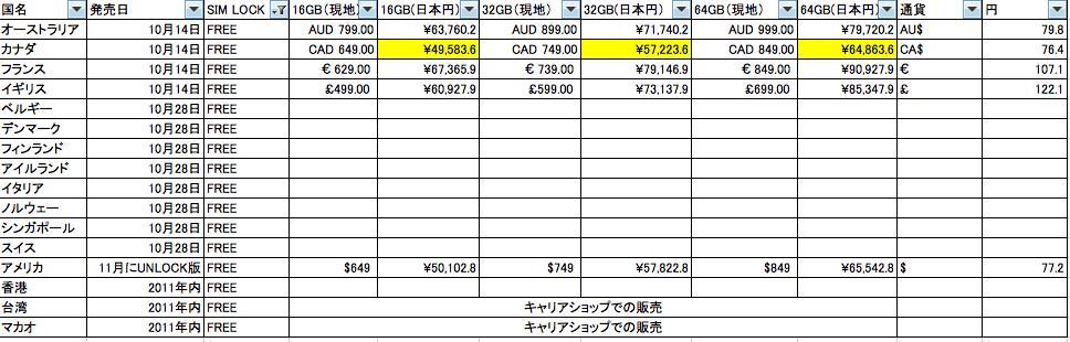 SIM LOCK FREEのiPhone4Sを発売している、もしくは発売しそうな国・地域の発売予定日とすでに発売している国・地域では、Apple Storeで販売している場合には、その現地価格と現在の日本円換算価格をまとめてみました。