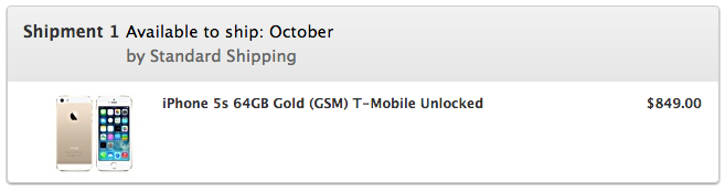 米国も20日にApple Storeで5Sの販売が始まったので、とりあえず、人柱として、iPhone 5s 64GB Gold (GSM) T-Mobile Unlockedを米国のオンラインのアップルストアで購入しました。$849.00。発送は、10月(何日とかもないんでいつかわかりませんが)となっています。手元に届いたら、当ブログで公開する予定です。