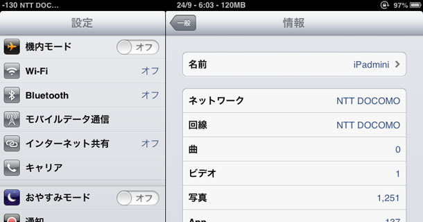SIMロックフリーのiPad mini(A1455)、verisonのMD542LL/Aです。あと、mopera+Xiパケ・ホーダイ フラットのnanoSIM。iPad miniなので、もちろん、Xi LTEで使えています。SPモードは入れてたか覚えていません。これを入れ替えます。