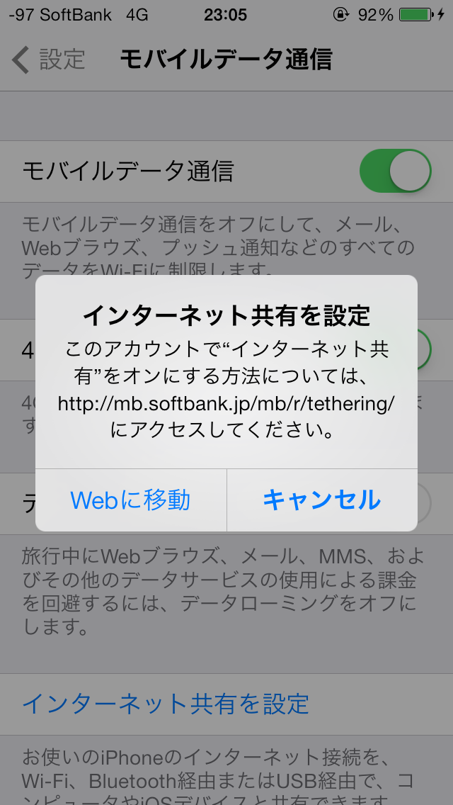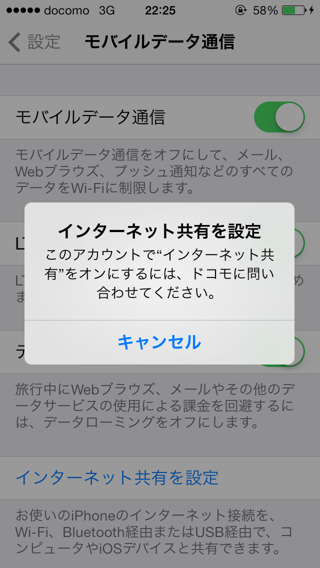 このSIMはテザリングオプションをつけていないので、やはりテザリングはできませんでした。